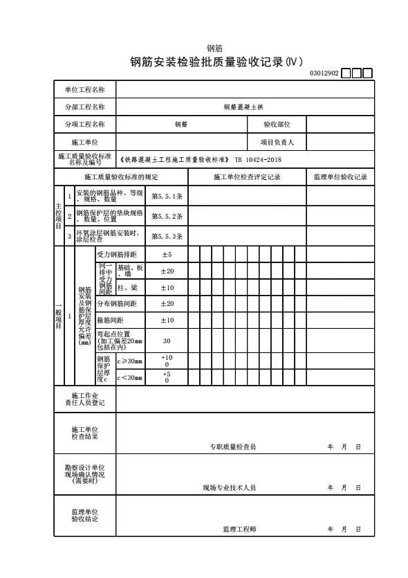 表格名称:03012902 钢筋安装检验批质量验收记录(Ⅳ)