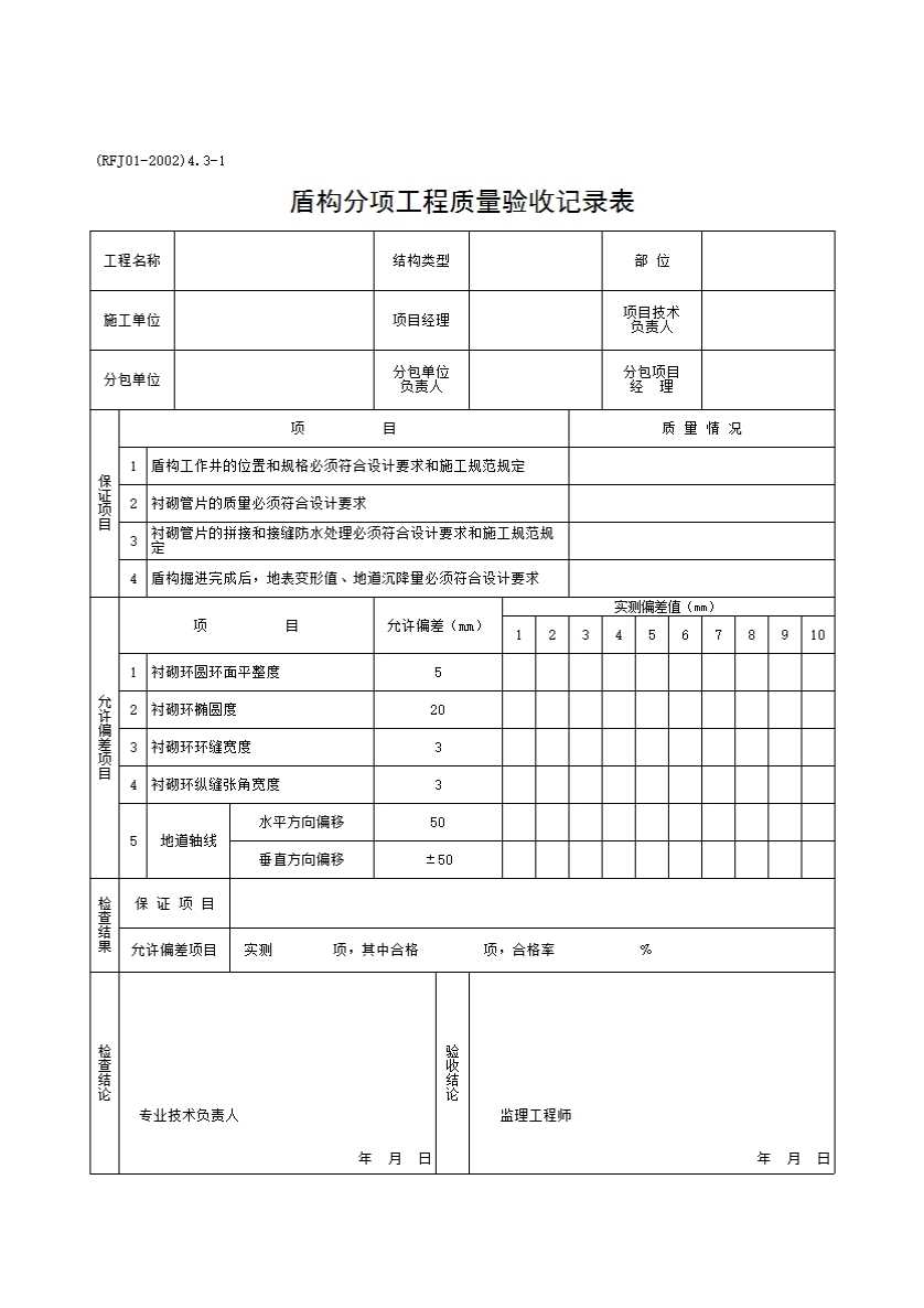 盾构分项工程质量验收记录表