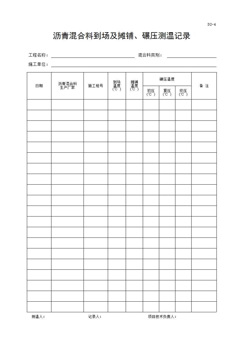 表格名称:沥青混合料到场及摊铺、碾压测温记录