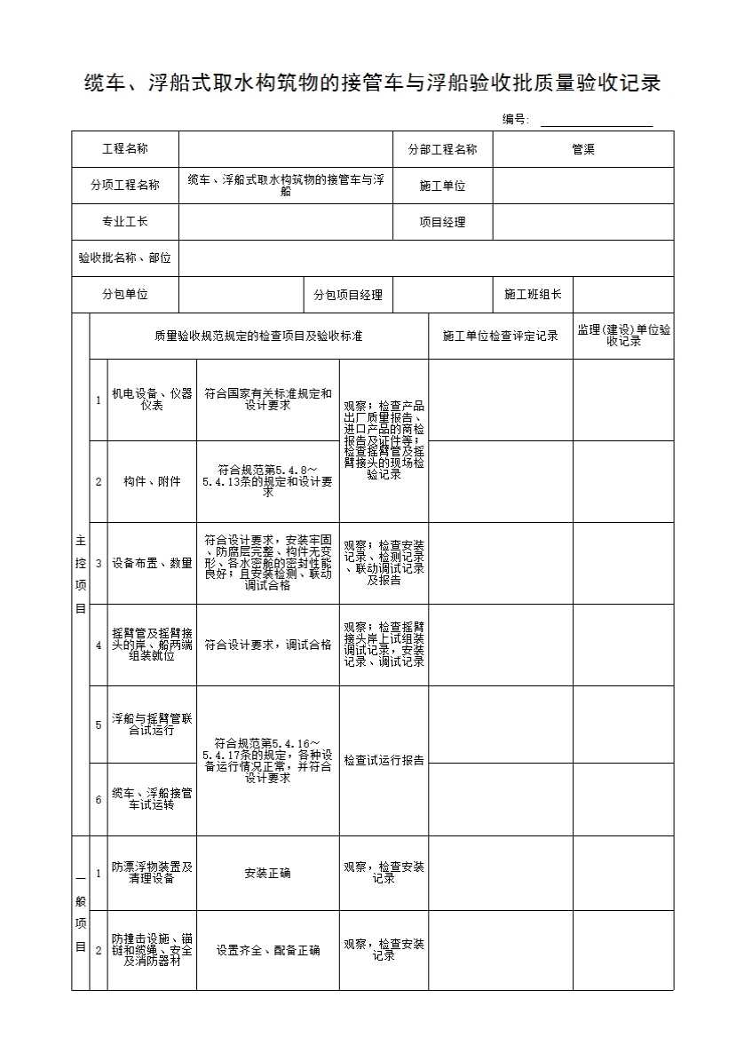1 机电设备、仪器仪表应符合国家有关标准规定和设计要求,浮船接管车、摇臂管等构件、附件应符合本规范第5.4.8~5.4.13条的规定和设计要求;