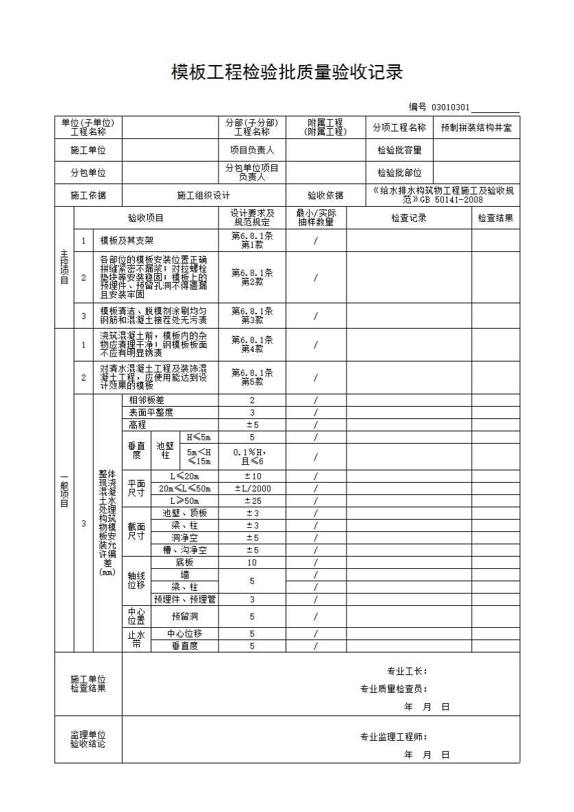 表6.8.1整体现浇 混凝土水处理构筑物模板安装允许偏差