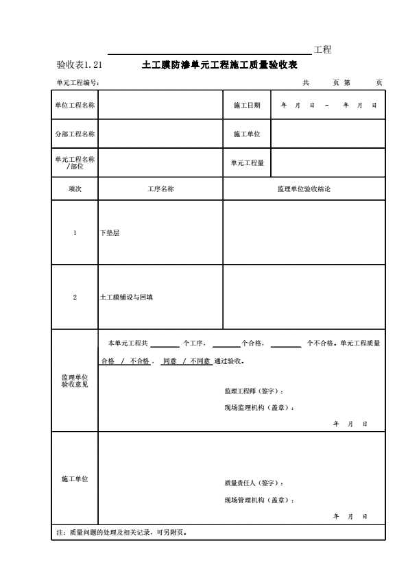 表格名称:表1.21 土工膜防渗单元工程施工质量验收表