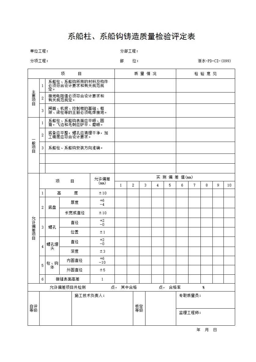 表格名称:099 系船柱、系船钩铸造质量检验评定表