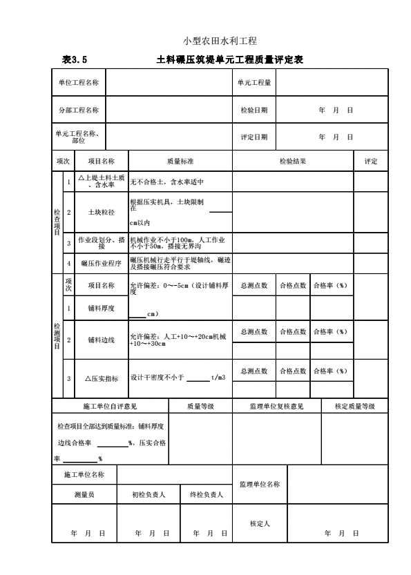 表格名称:表3.5 土料碾压筑堤单元工程质量评定表