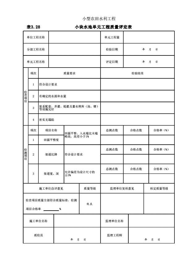 表格名称:表3.28 小块水地单元工程质量评定表