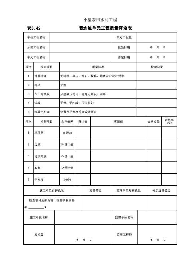 表格名称:表3.42 晒水池单元工程质量评定表