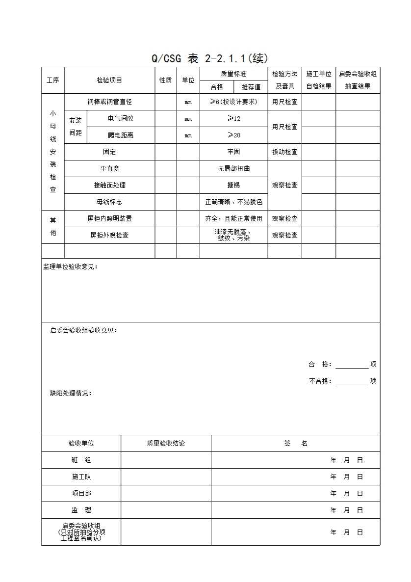 QCSG 表 2-2.1.1 控制、保护屏安装 分项工程质量验收记录表