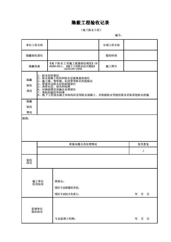表格名称:隐蔽工程验收记录(地下防水工程)