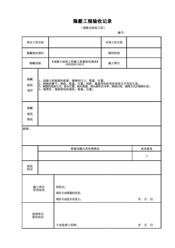 表格名称:隐蔽工程验收记录(装配式结构工程)