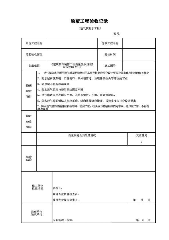 表格名称:隐蔽工程验收记录(透气膜防水工程)