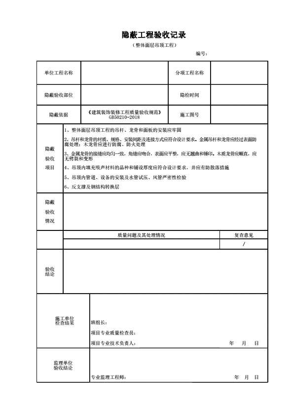 表格名称:隐蔽工程验收记录(整体面层吊顶工程)