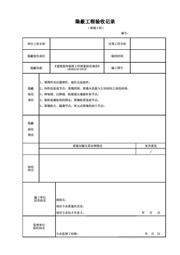 表格名称:隐蔽工程验收记录(幕墙工程)