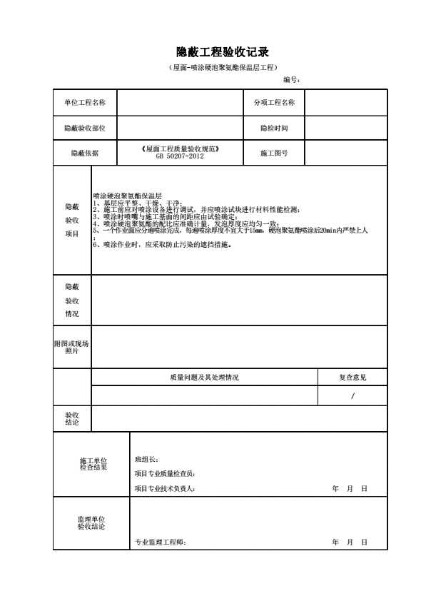 表格名称:隐蔽工程验收记录(屋面-喷涂硬泡聚氨酯保温层工程)