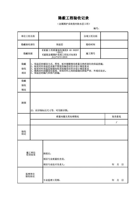 表格名称:隐蔽工程验收记录(金属围护系统保温层工程)