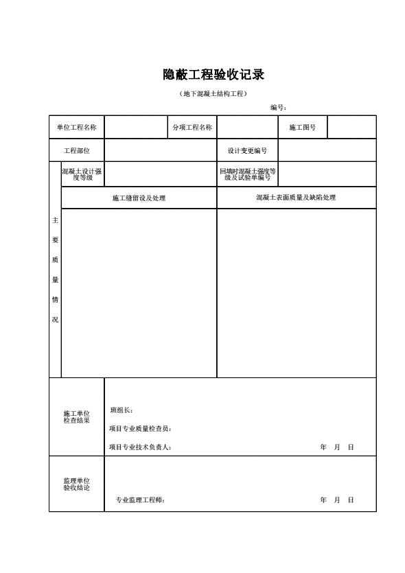 表格名称:隐蔽工程验收记录(地下混凝土结构工程)