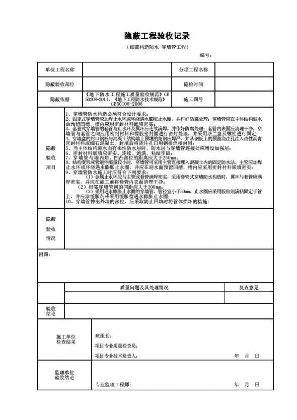 表格名称:隐蔽工程验收记录(细部构造防水-穿墙管工程)