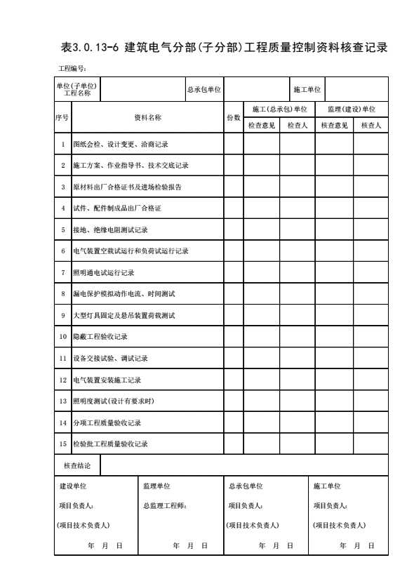 表格名称:表3.0.13-6 建筑电气分部(子分部)工程质量控制资料核查记录
