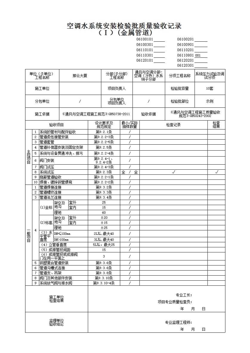 空调水系统安装检验批质量验收记录(Ⅰ)(金属管道)