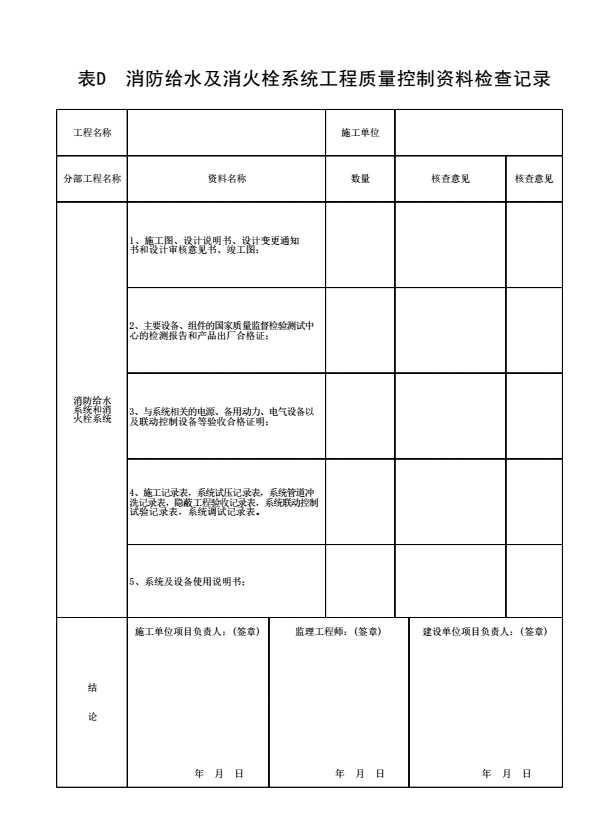 表D 消防给水及消火栓系统工程质量控制资料检查记录