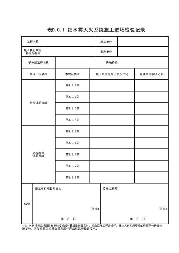 表格名称:表D.0.1 细水雾灭火系统施工进场检验记录
