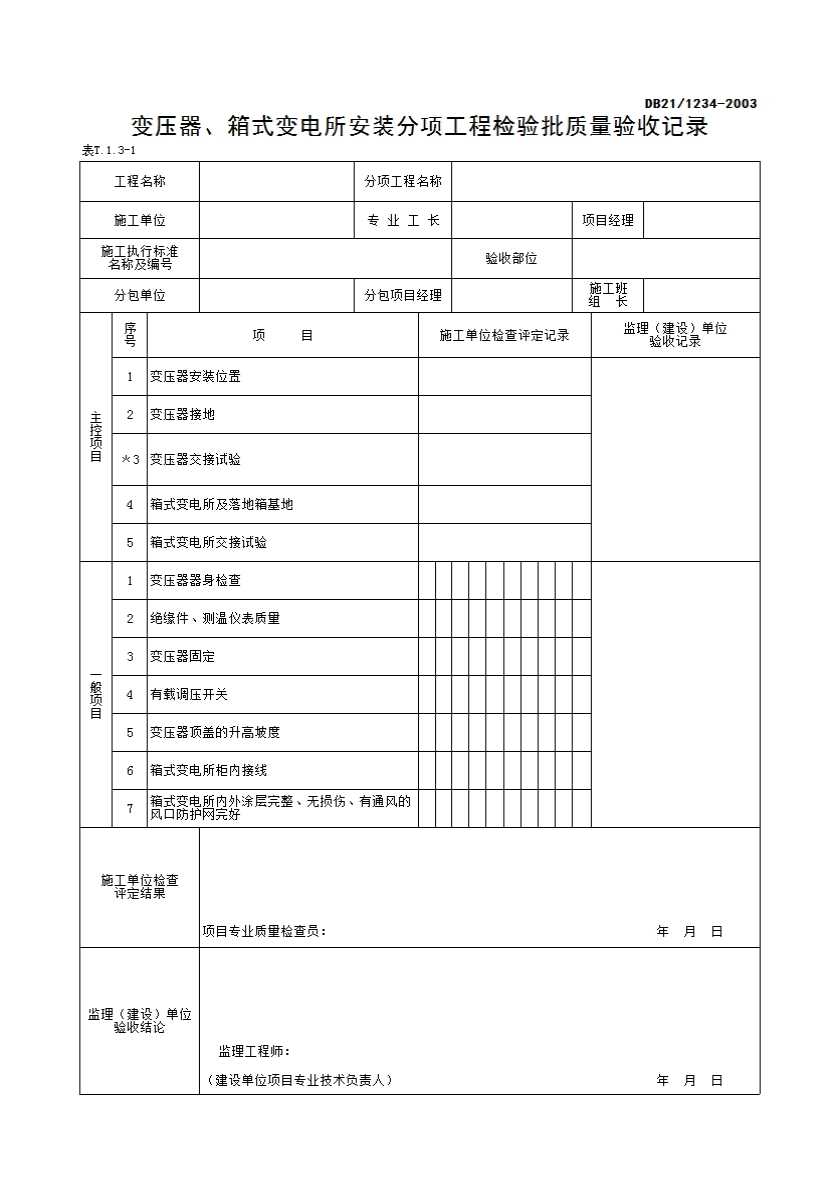 表格名称:表T.1.3 变压器、箱式变电所安装分项工程检验批质量验收记录