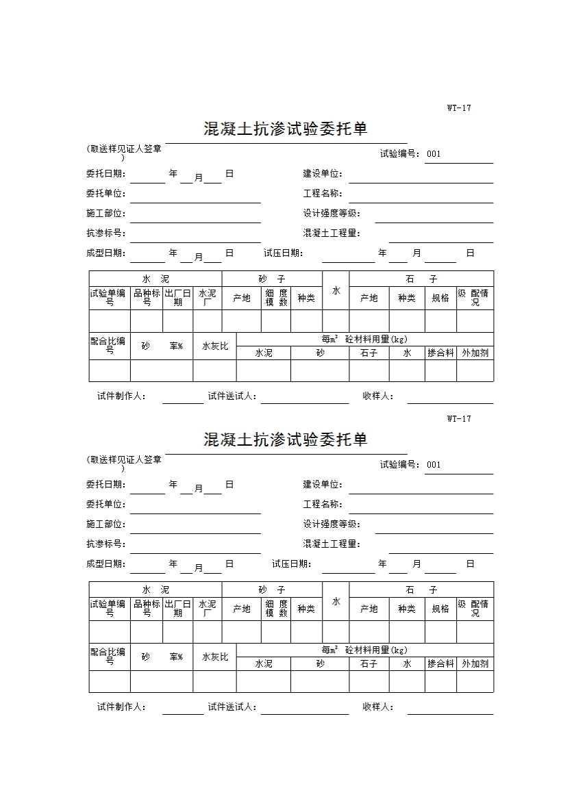 表格名称:WT-17 混凝土抗渗试验委托单