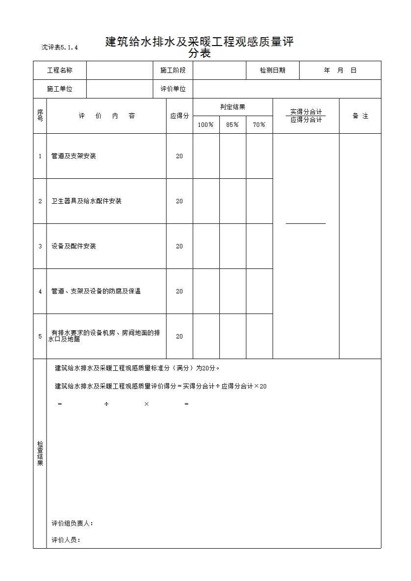沈评表5-1-4 建筑给水排水及采暖工程观感质量评分表