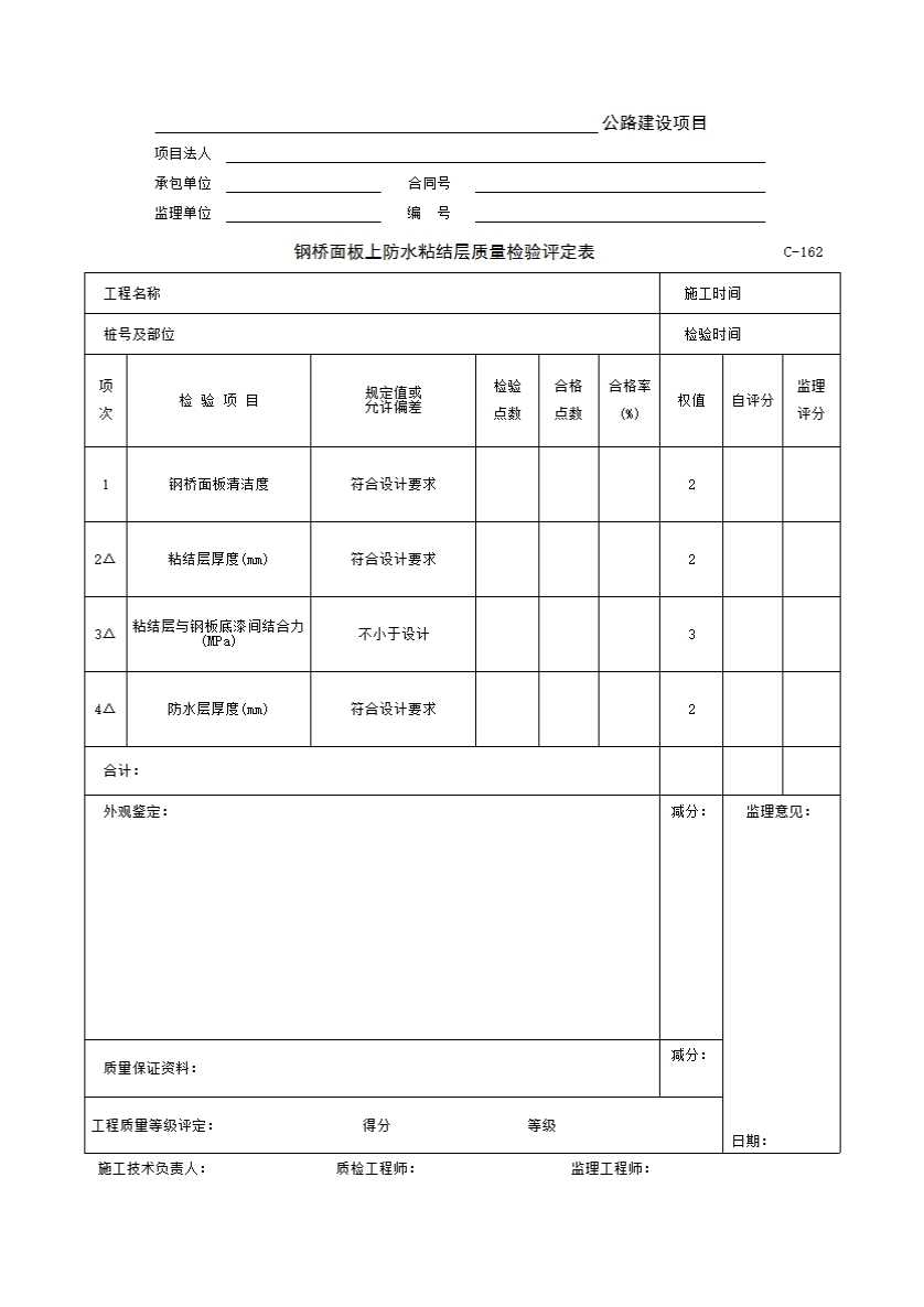 表格名称:C-162 钢桥面板上防水粘结层质量检验评定表