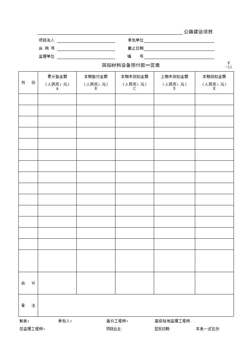 表格名称:F-11 回扣材料设备预付款一览表