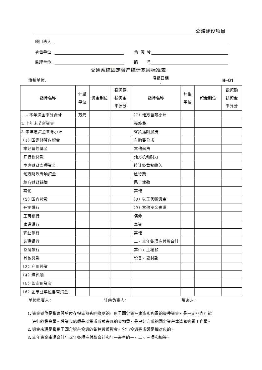 表格名称:H-01 交通系统固定资产统计基层标准表