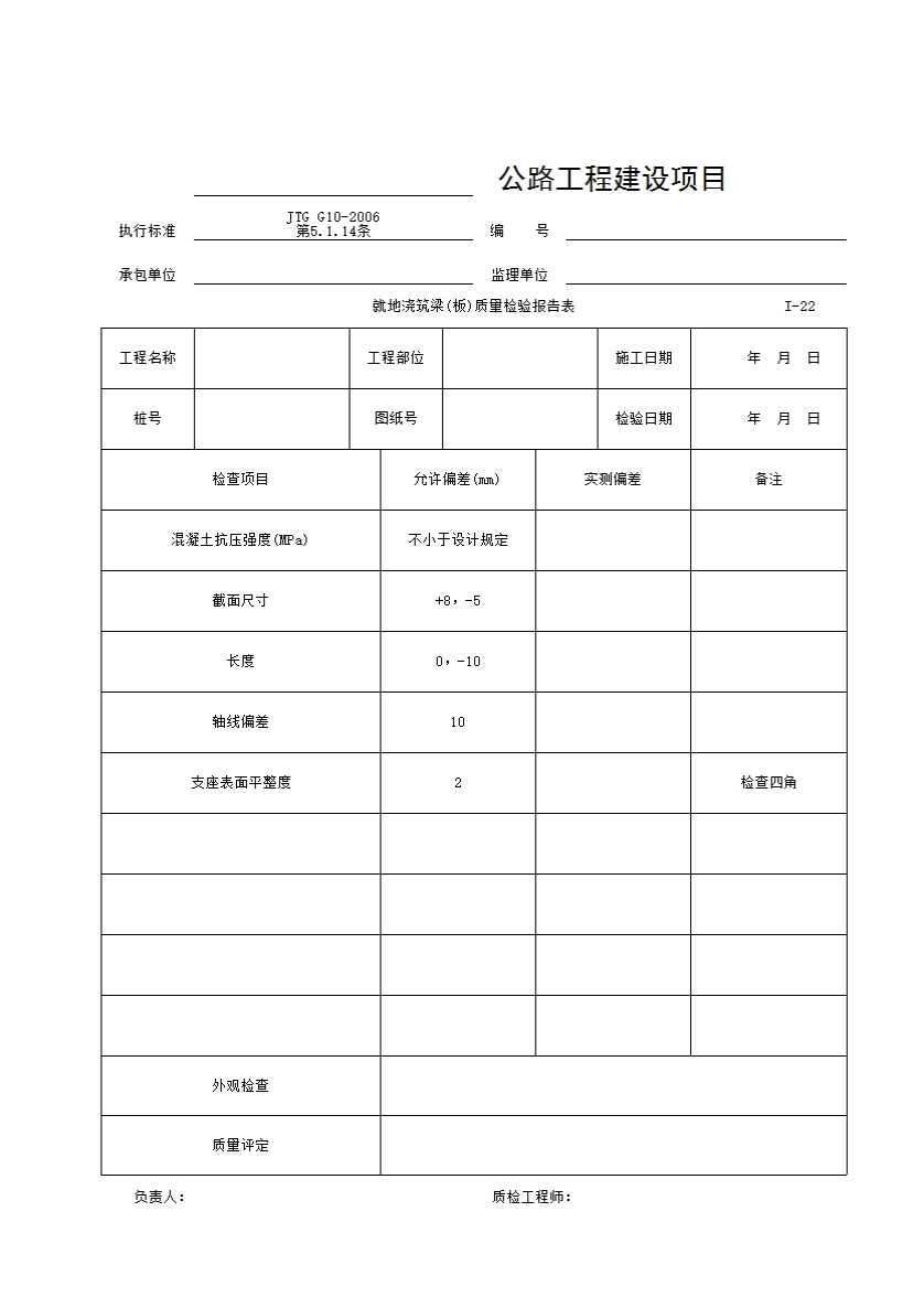 表格名称:I-22表 就地浇筑梁(板)质量检验报告表
