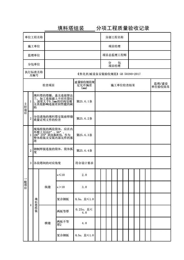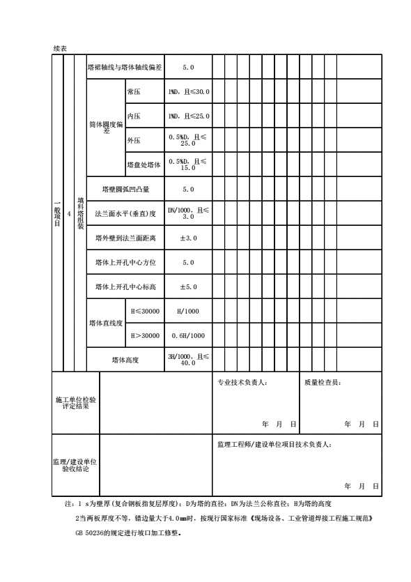表格名称:填料塔组装分项工程质量验收记录