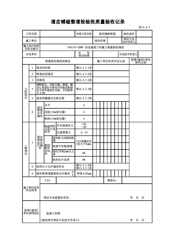 表格名称:表13.4.7 道岔铺碴整道检验批质量验收记录