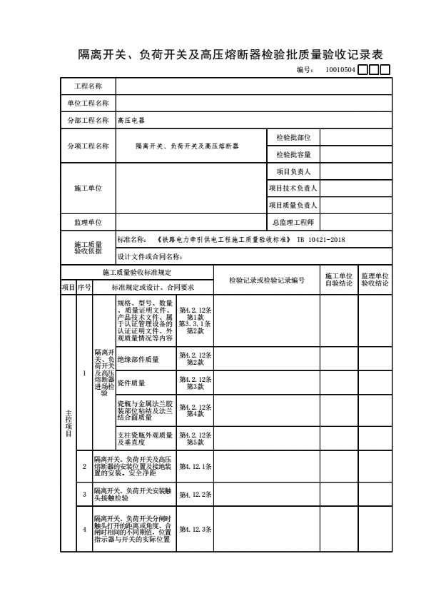 表格名称:10010504 隔离开关、负荷开关及高压熔断器检验批质量验收记录表
