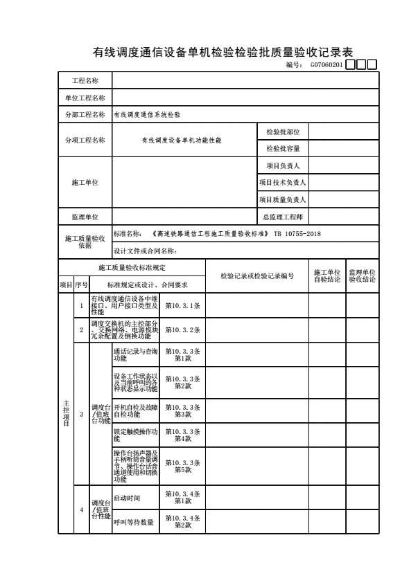 G07060201 有线调度设备单机功能性能检验批质量验收记录表