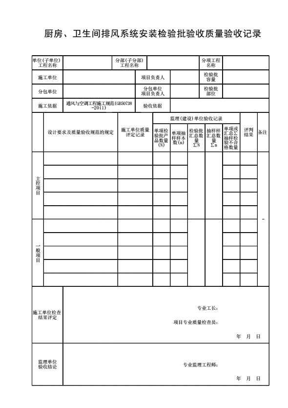 表格名称:厨房、卫生间排风系统安装检验批验收质量验收记录