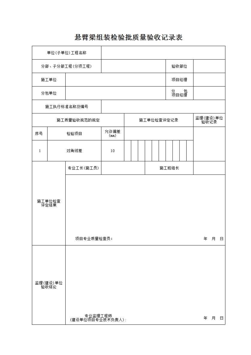 表格名称:悬臂梁组装检验批质量验收记录表