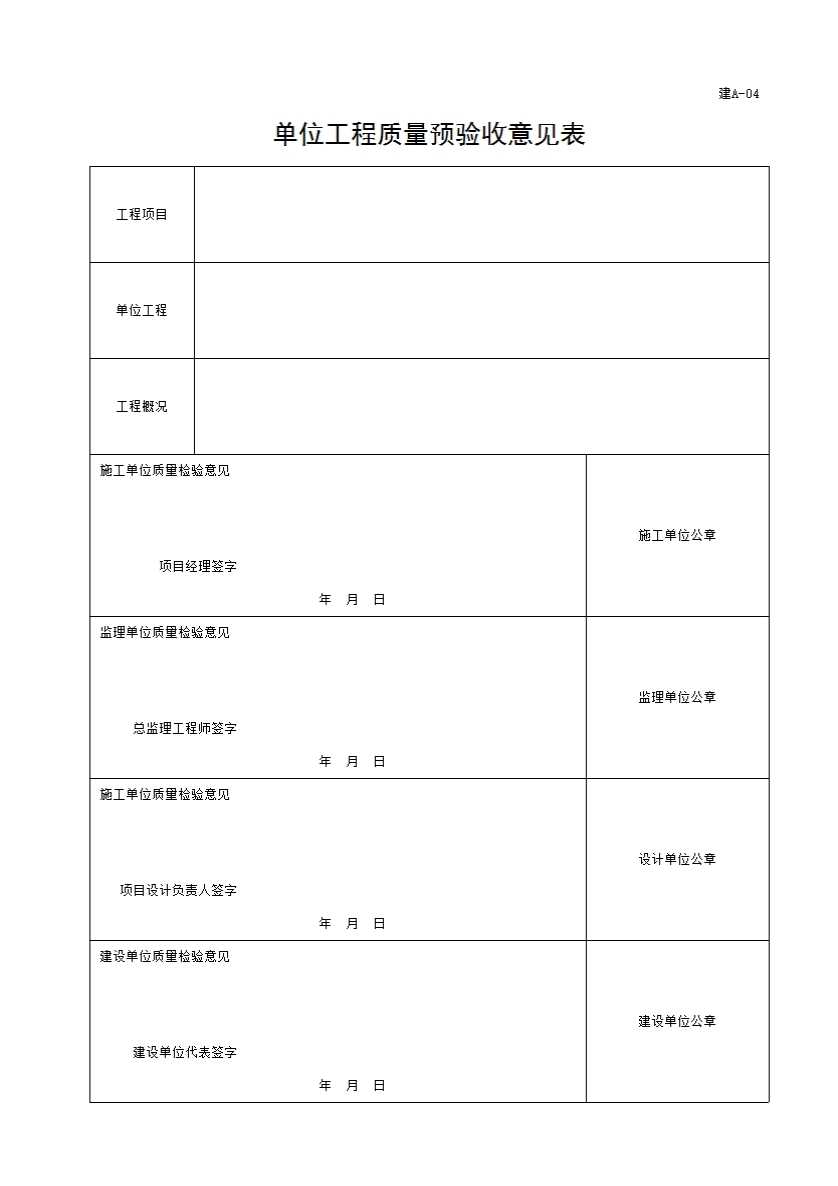 4、(建A-04)单位工程质量预验收意见表