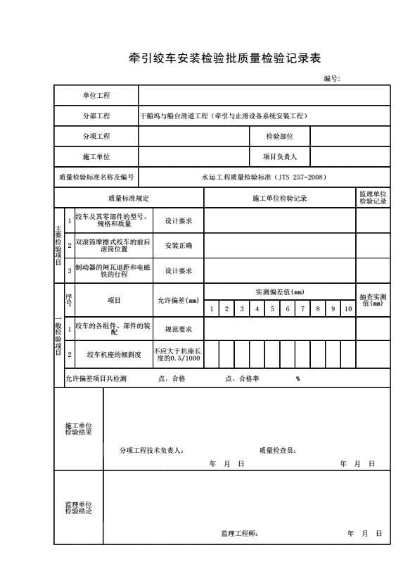牵引绞车安装检验批质量检验记录表