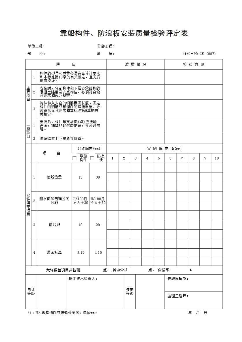 087 靠船构件、防浪板安装质量检验评定表