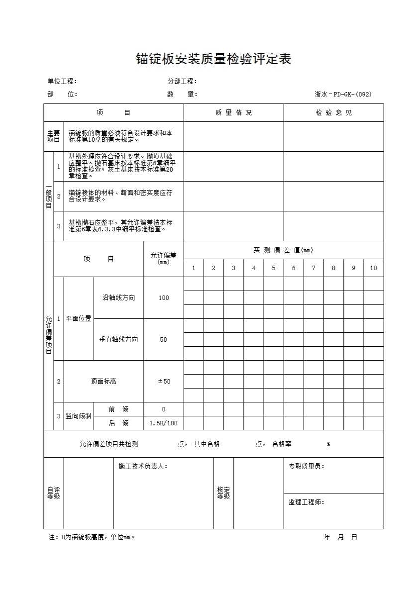 表格名称:092 锚锭板安装质量检验评定表