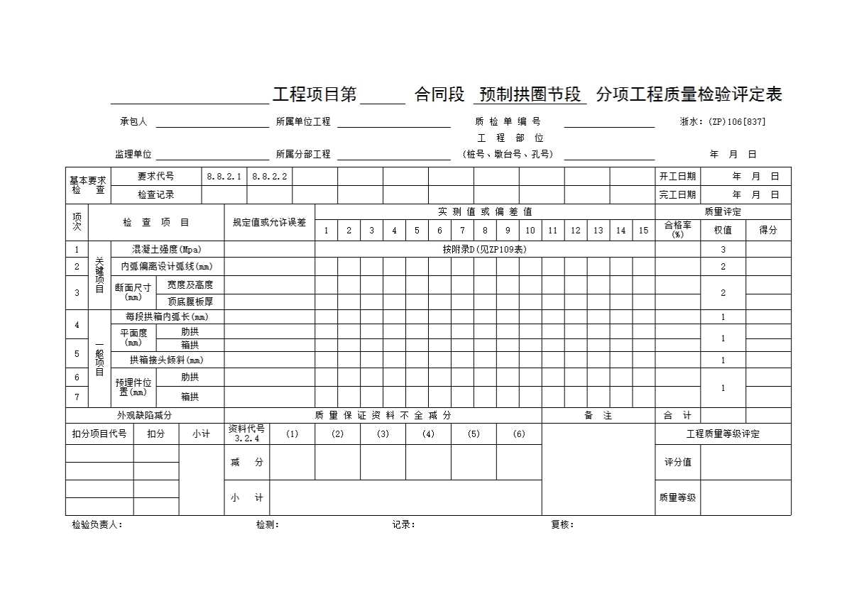 表格名称:037 预制拱圈节段分项工程质量检验评定表