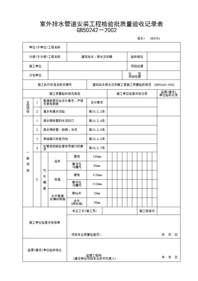 表格名称:175 室外排水管道安装工程检验批质量验收记录表