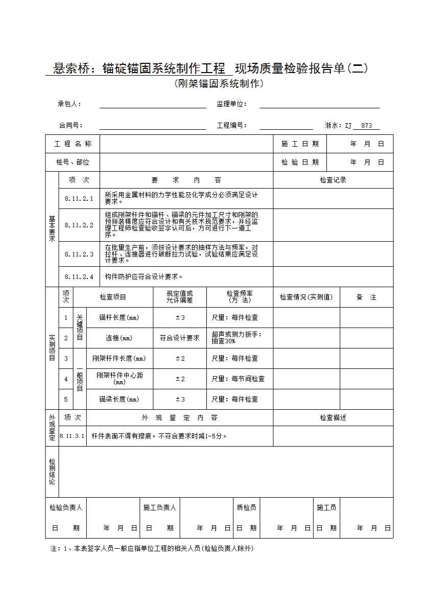 表格名称:浙水:ZJ873 悬索桥:锚碇锚固系统制作工程现场质量检验报告单(二)