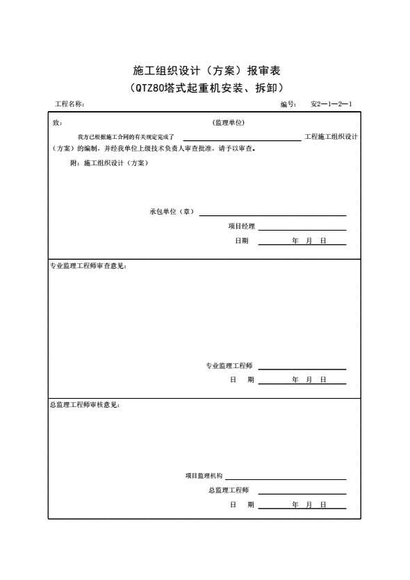 表格名称:施工组织设计(方案)报审表 ( QTZ80塔式起重机安装、拆卸) 安2—1—2—1