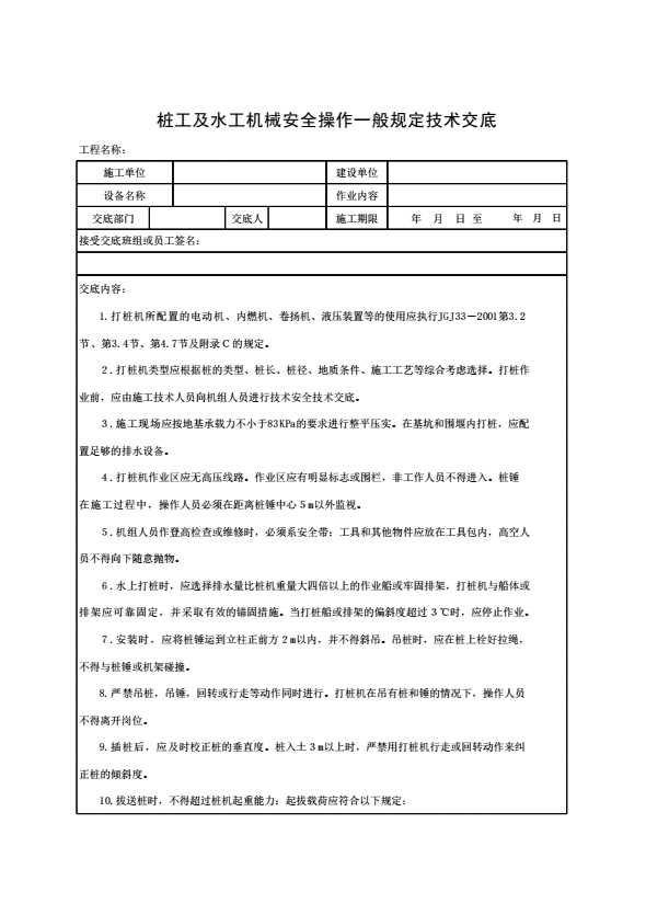 表格名称:桩工及水工机械安全操作一般规定技术交底
