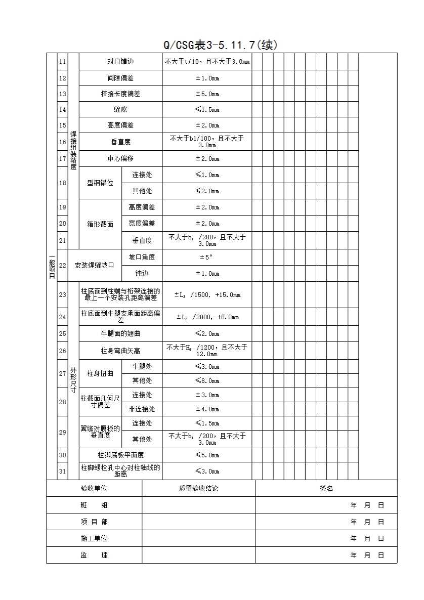 表格名称:QCSG 表 3-5.11.7 钢构件(单层钢柱)组装工程检验批质量验收记录表