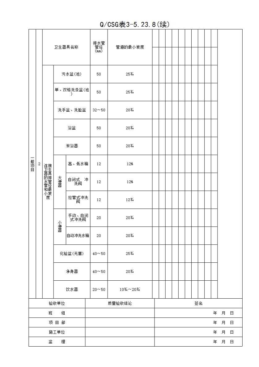 QCSG 表 3-5.23.8 卫生器具排水管道安装检验批质量验收记录表