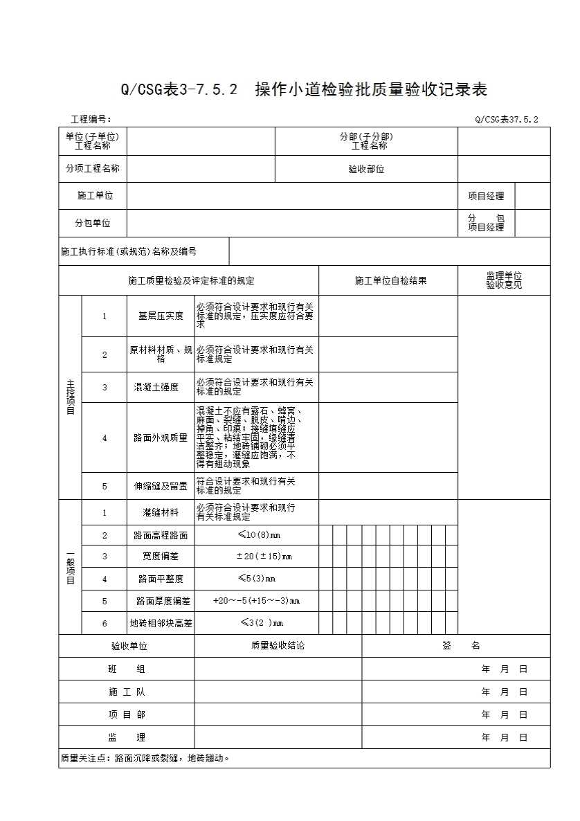 QCSG 表 3-7.5.2 操作小道检验批质量验收记录表