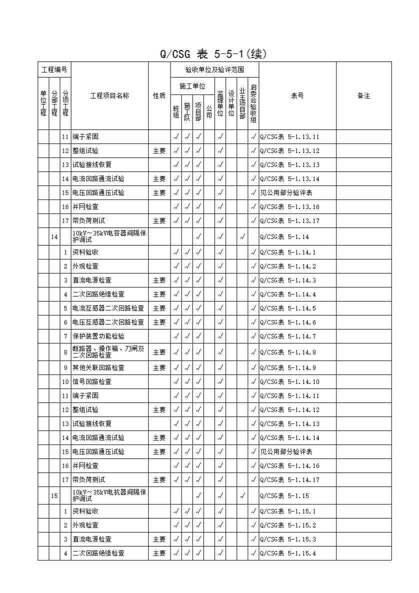 QCSG 表 5-5-1 变电继电保护调试工程质量验收评定范围划分
